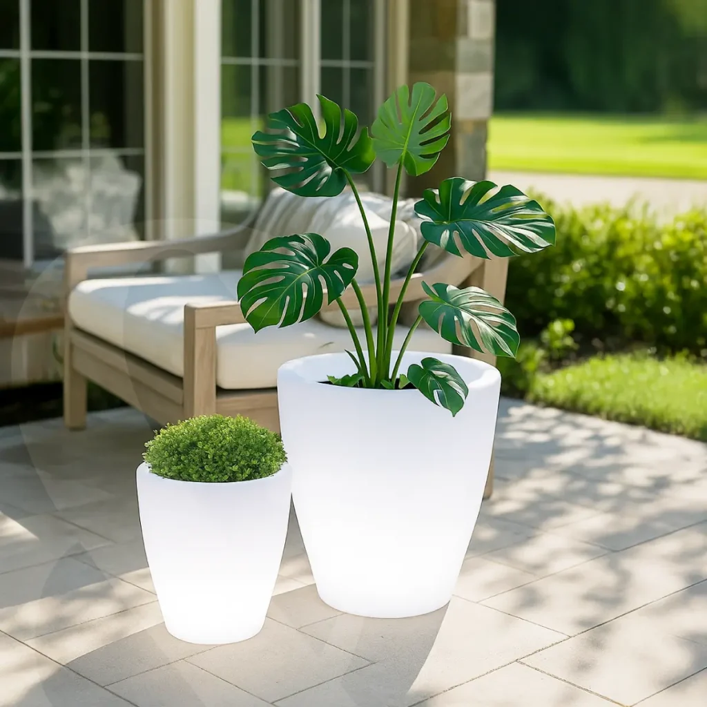 This is a conical planter with a large planting base. It features rounded lines and a smooth textured finish. Available in various sizes, colors, and finishes.